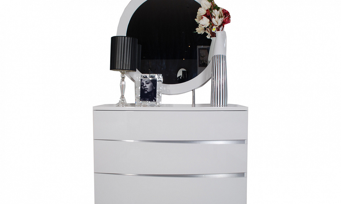 Прямоугольный силуэт и металлические декоративные вставки придают комоду футуристический вид.