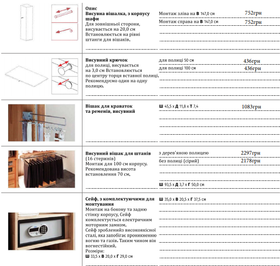 Базовый вариант: 2 полки и штанга для вешалок в каждой секции. Дополнительно можно заказать аксессуары к шкафу (смотрите фотографии, Вы найдете цены, размеры и предложения)